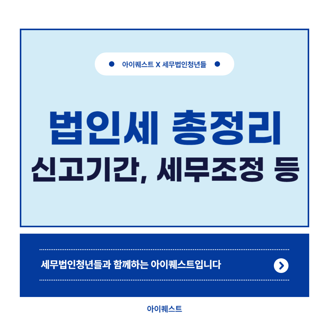 안녕하세요.세무법인청년들과 함께하는 아이퀘스트입니다. 오늘은 법인세 신고 및 납부에 대해 안내드리겠습니다. 법인세 법인세란 법인에게 귀속되는 소득에 대하여 부과되는 세금입니다. 다만 법인세는 법인의 구분에 따라 과세 범위가 달라집니다. 법인은 내국 또는 외국, 영리 및 비영리에 따라 다음과 같이 구분할 수 있으며, 구분에 따라 납세 의무 또한 달라지므로 참고하여 업무하시기 바랍니다. 법인의 종류각 사업연도 소득에 대한 법인세토지 등 양도소득에 대한 법인세미환류 소득에 대한 법인세청산소득내국영리국내·외 모든 소득OOO비영리국내·외 수익사업에서 발생하는 소득OXX외국영리국내원천소득OXX비영리국내원천소득 중 열거된 수익사업에서 발생한 소득OXX국가 및 지방자치단체납세 의무 없음 법인세 계산 법인세를 계산하..