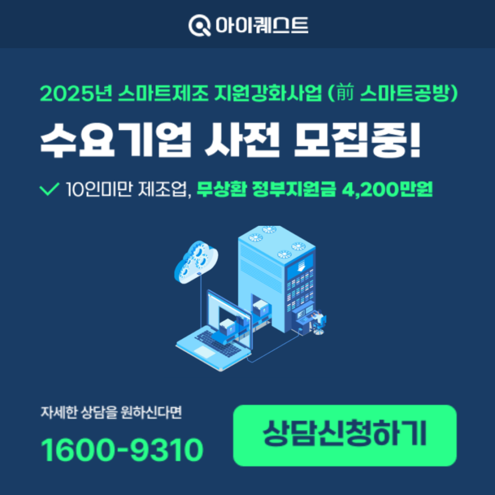 안녕하세요.기업의 비즈니스 환경에 최적화된 시스템 서비스를제공하는 아이퀘스트입니다.2025년 스마트제조 지원강화사업 (前 스마트공방)수요기업 사전 모집을 진행합니다.2025년 스마트제조 지원강화사업 (前 스마트공방) 수요기업 사전 모집스마트공방 사업 개요10인 미만 제조업체를 대상으로 제조 공정에 기초 스마트 기술을 접목 통해 디지털화 지원지원 대상소공인 (상시근로자 수 10인 미만 제조업)💡 상시근로자 수 계산 방법이 궁금하다면?https://blog.naver.com/iquest_official/223609052044 상시근로자 수 계산 방법과 산정 기준을 알아두는 게 중요한 이유5인 이상? 100인 이상? 상시근로자 수가 도대체 뭐야? 여러 정부 정책이나 정책자금, 근로기준법을 보다 보...