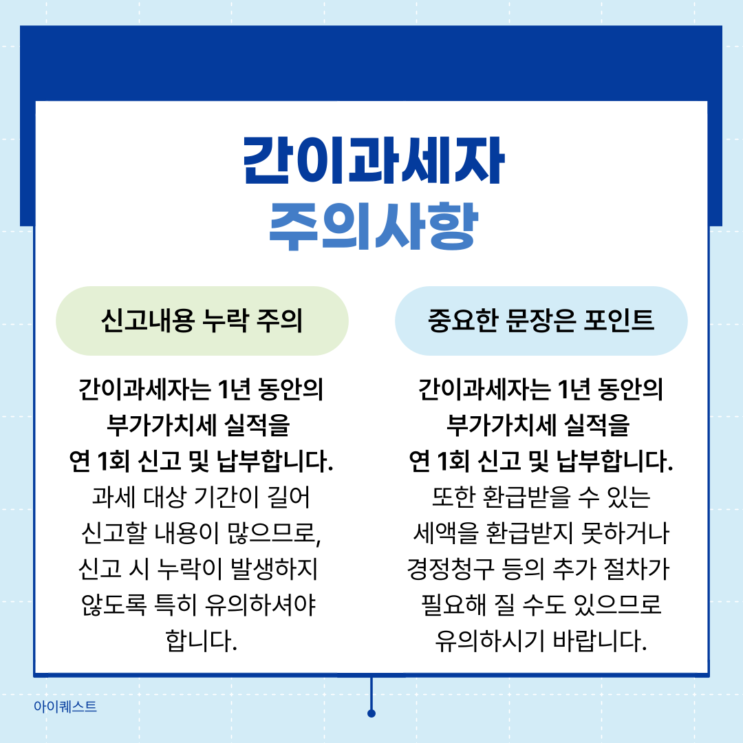 ✅ 간이과세자는 1년 동안의 부가가치세 실적을 연 1회 신고 및 납부합니다. 과세 대상 기간이 길어 신고할 내용이 많으므로, 신고시 누락이 발생하지 않도록 특히 유의하셔야 합니다.