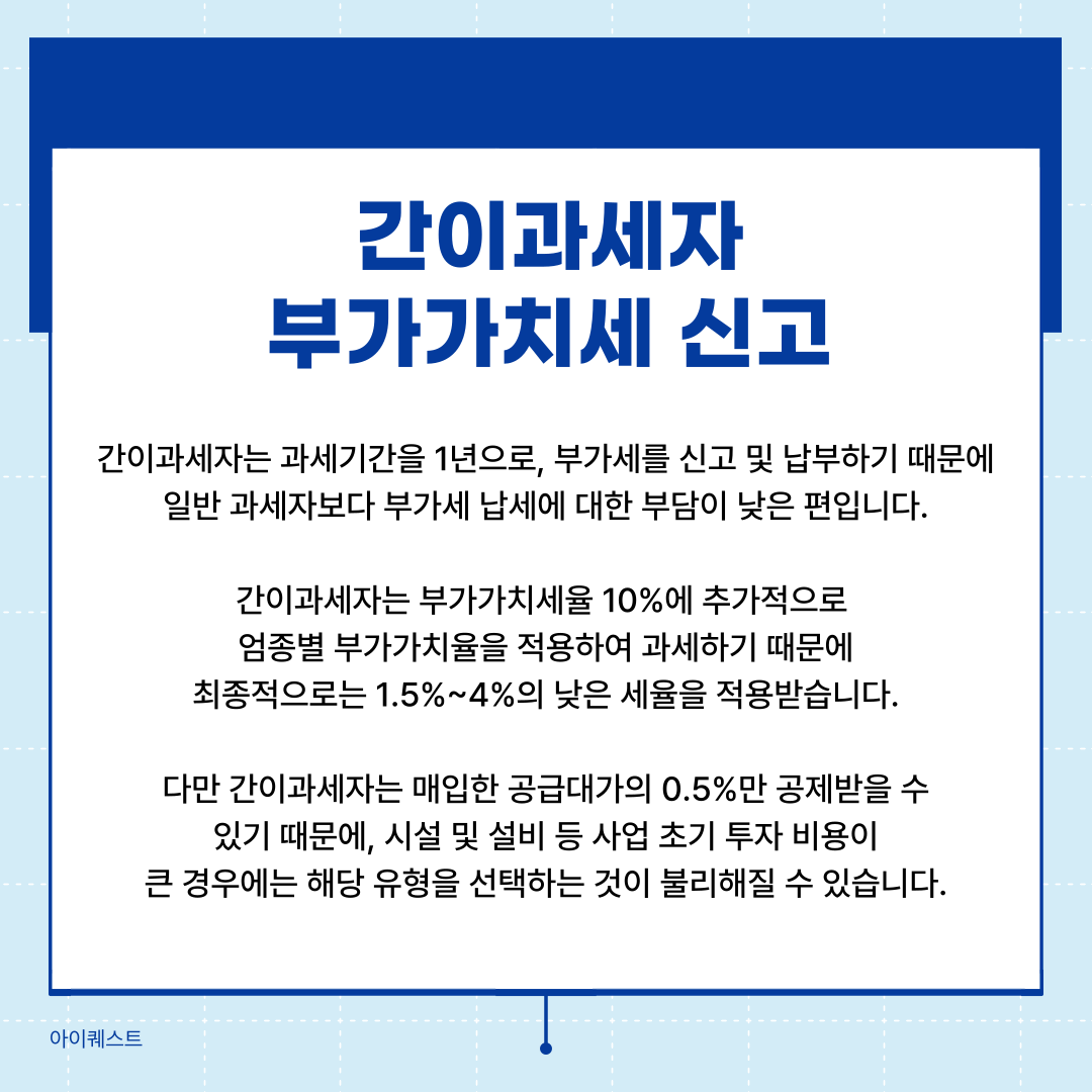 간이과세자란 주로 소비자를 상대하는 소규모 영세사업자로, 부가세 납세 부담이 낮고 다양한 세제지원을 받는 과세 유형입니다. 간이과세자는 무엇보다 부가세 신고 횟수가 적고, 실질적으로 부담하는 부가세가 낮기 때문에 신규로 사업을 하시는 분들께서는 간이과세 유형으로 사업자 등록을 하는 경우가 많습니다.