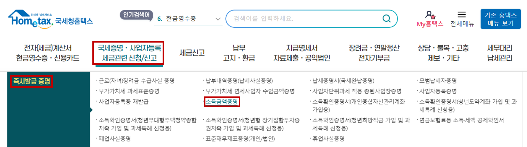 1. 홈택스 로그인 - 국세증명·사업자등록·세금관련 신청/신고 - 즉시발급 증명 - 소득금액 증명 클릭