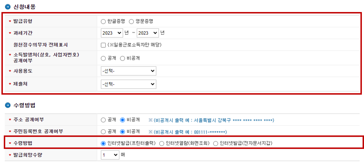 3. 과세기간과 제출처 등 신청내용과 수령방법 선택, 하단 '신청하기' 버튼 클릭