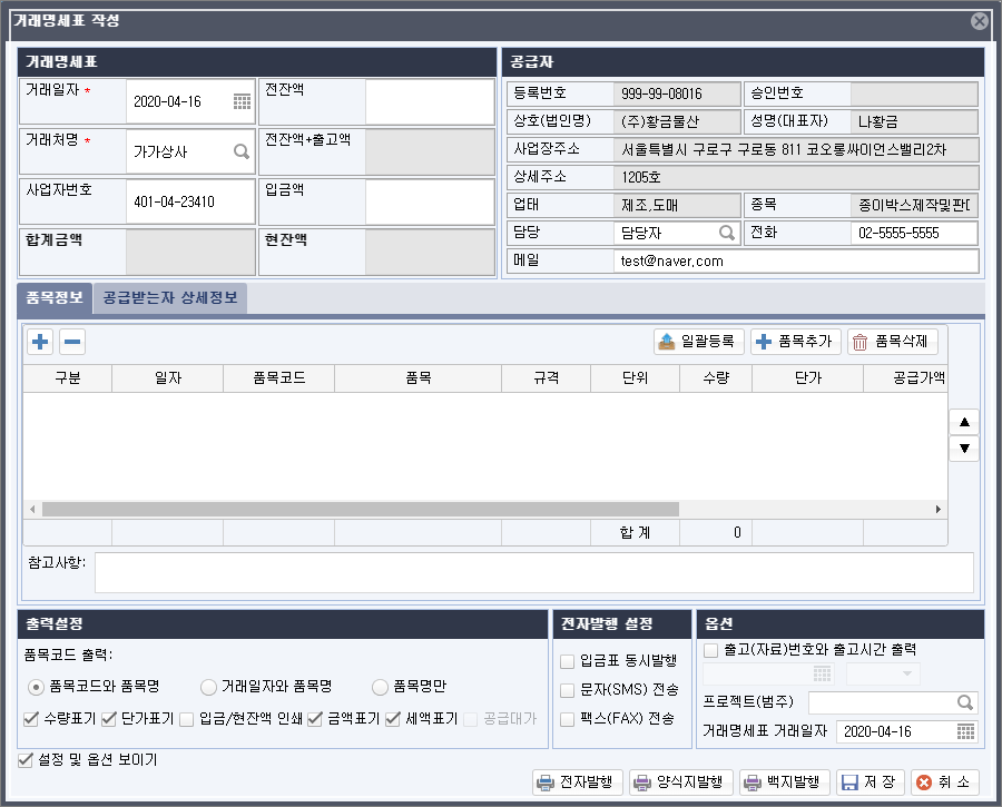 - 공급자 정보(상호 또는 법인명, 성명, 사업장 주소, 전화, 팩스 등)