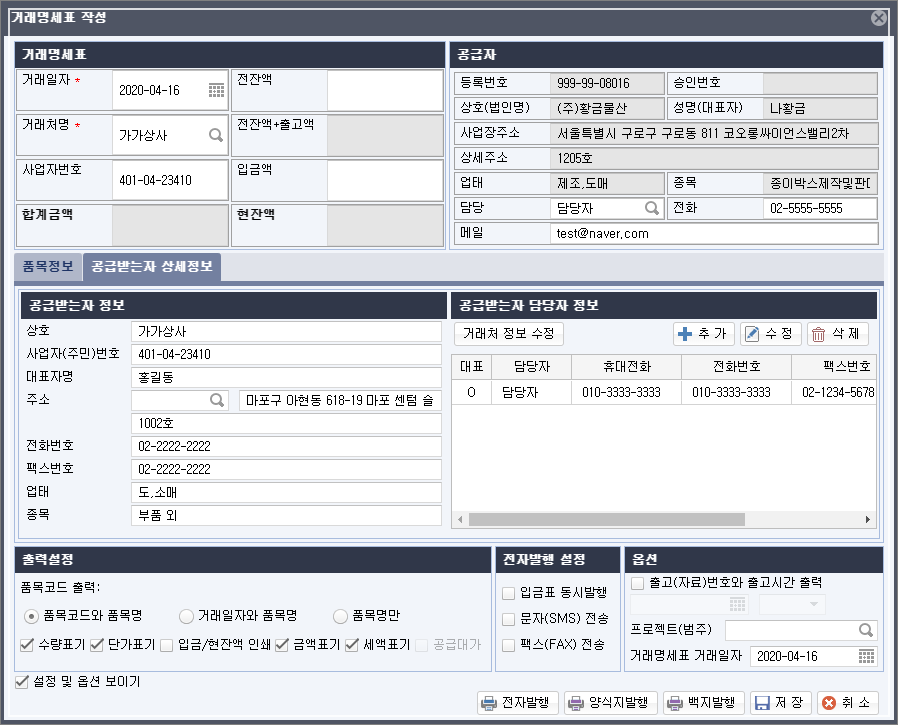 - 공급자 정보(상호 또는 법인명, 성명, 사업장 주소, 전화, 팩스 등)
