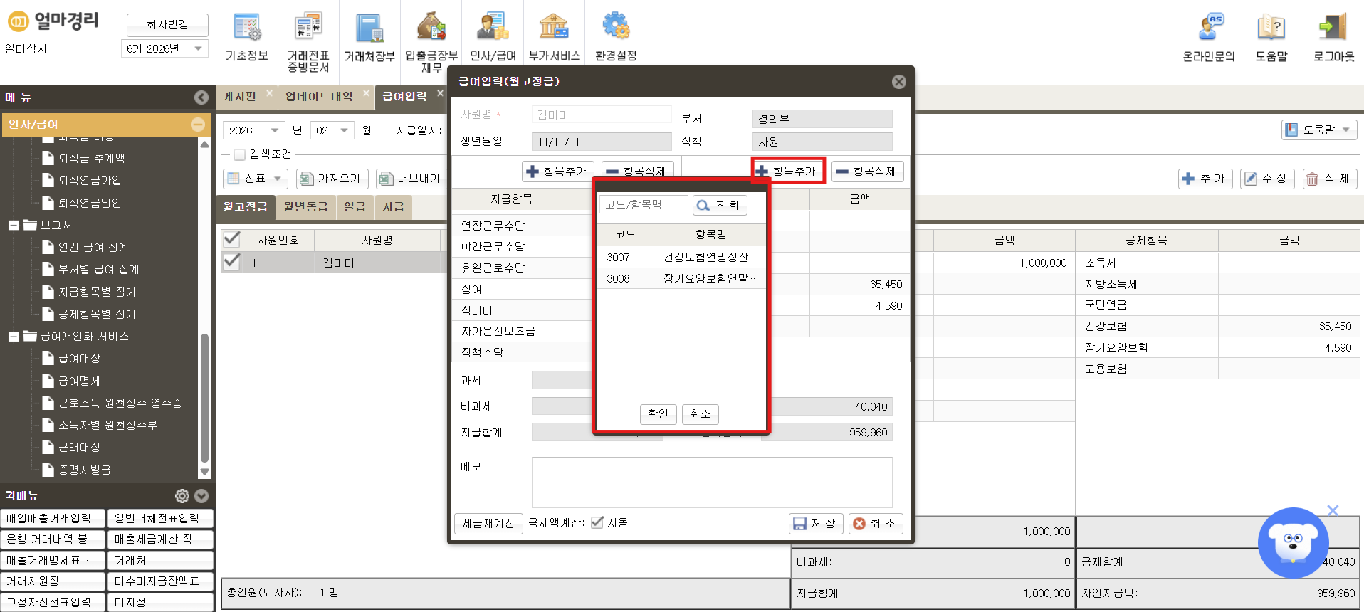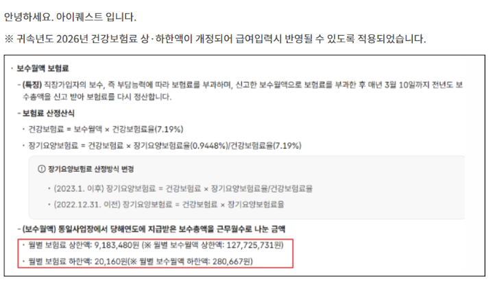 2026년 건강보험료 상·하한액 개정 사항이 시스템에 자동 적용되어, 급여 입력 시 최신 기준으로 자동 계산됩니다.
