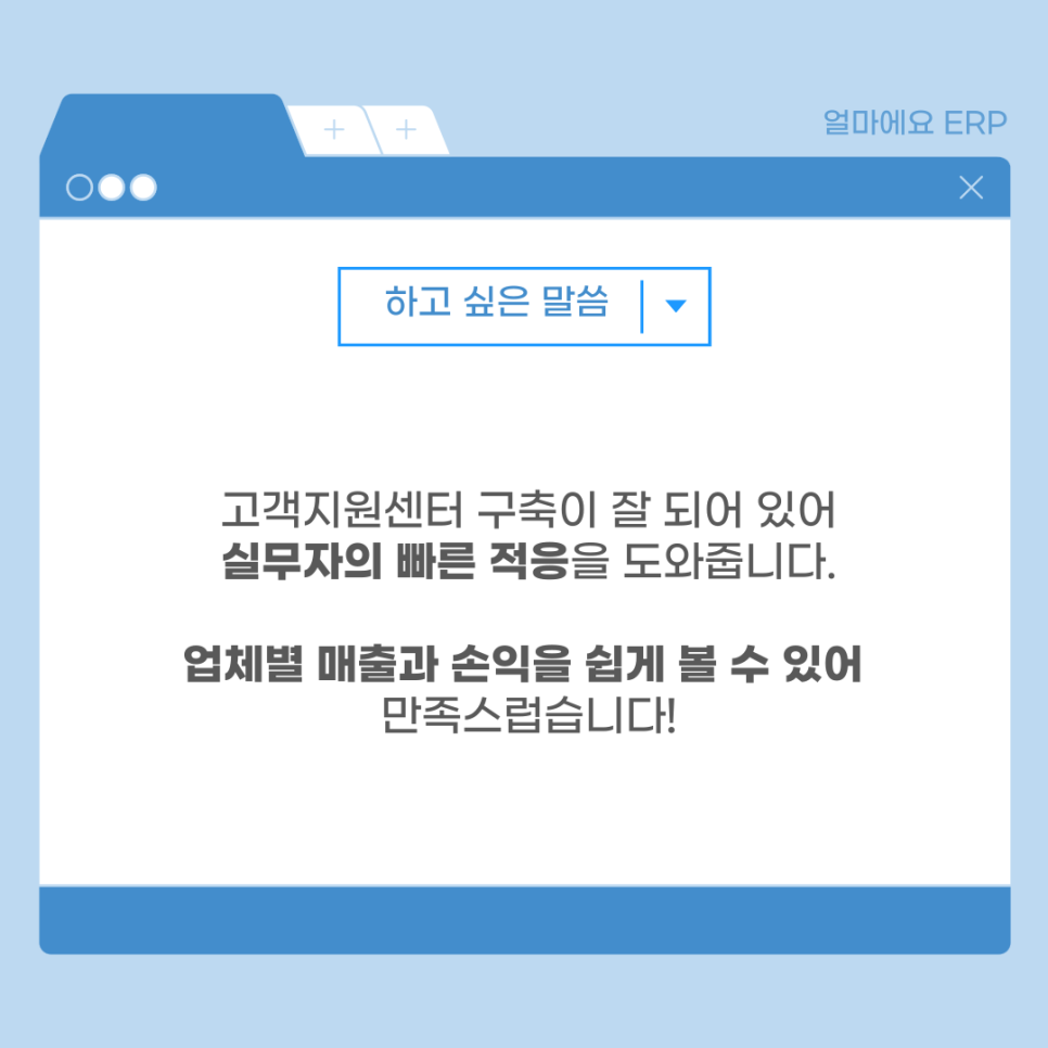 고객지원센터 구축이 잘 되어 있어 적응 하는데 2개월이 채 안 걸린 것 같습니다. 얼마에요 ERP 같은 프로그램을 처음 사용하는 초보자인 제가 이정도였으니 익숙하신 분들께서는 더 빠르게 정착할 수 있을 거라는 생각이 듭니다. 업체별 매출과 손익을 쉽게 볼 수 있어 매우 만족합니다.