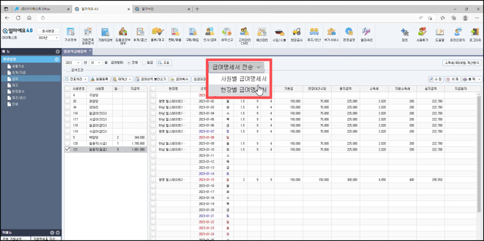 - 일용직 급여 관리 : 일수, 시간, 금액에 맞춘 수당 자동 계산 및 4대 보험 관리, 일용근로소득 지급명세서, 근로내용확인신고서 지원