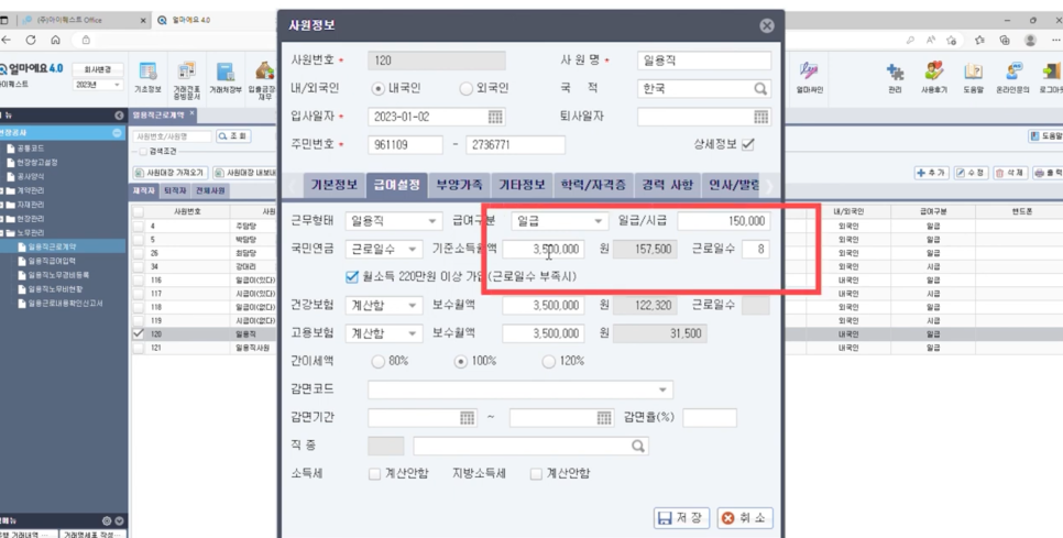 현장 별 일용직 급여 계산 및 4대보험/수당 계산이 자동으로 되는지 확인해 보세요.