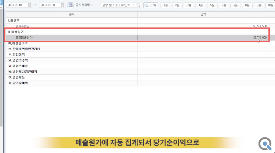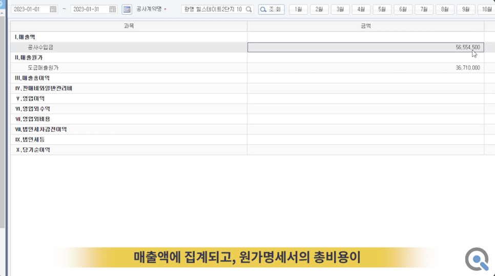 이후 건설사에서 계약금과 중도금을 청구하면 공사 손익계산서 내에 매출액으로 집계되며, 여기서 매출원가를 제외하면 당기순이익이 산출됩니다.