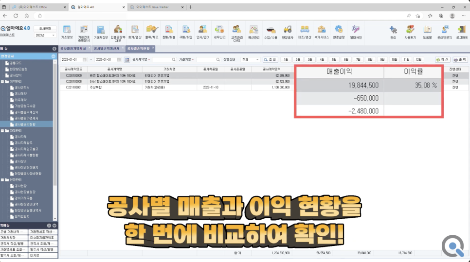 마지막으로 [얼마에요]에서는 ‘공사별 손익현황'을 통해 실시간으로 공사 현장별 매출과 이익 현황을 파악할 수 있어요.