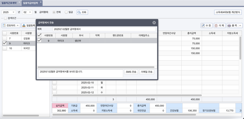 급여명세서도 이메일과 문자 메시지로 바로 전달할 수 있고, ‘일용직 노무현황’에서 일용직 임금이 얼마나 지급됐는지 확인할 수 있어요.