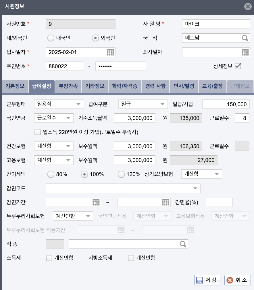 하지만 등록 시점에서는 이를 알 수 없어서 4대보험을 어떻게 설정할 지 모르실 수 있는데요. [얼마에요ERP]에서는 근무일수를 기준으로 4대 보험에 가입할 수 있게 설정할 수 있어요. 근무일수가 부족하더라도 월소득 220만원 이상이면 자동으로 가입할 수 있게 설정할 수 있죠.