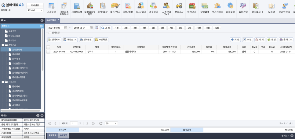 아이퀘스트의 건설업 특화 ERP [얼마에요]에서 ‘공사견적서’ 기능을 이용하면 ERP에서 바로 공사견적서를 작성하고 발행할 수 있어요.