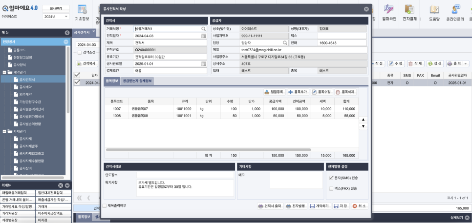 그리고 공사견적서를 작성한 후에는 견적서를 인쇄할 수도 있지만 전자발행도 가능해요. 전자발행을 이용하면 거래처 정보에 등록된 이메일과 전화번호, 팩스 등으로 견적서를 발행할 수 있어요. 이를 통해, 종이견적서 전달에 소요되는 불필요한 시간을 줄일 수 있습니다.
