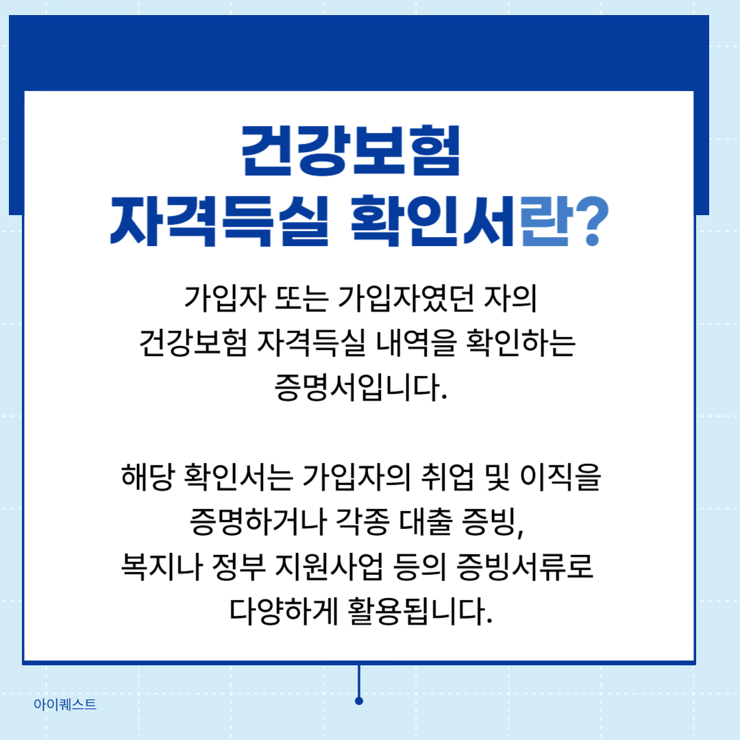 건강보험 자격득실 확인서란 가입자 또는 가입자였던 자의 건강보험 자격득실 내역을 확인하는 증명서입니다. 해당 서류는 가입자의 취업 및 이직을 증명하거나 각종 대출 증빙, 복지나 정부 지원 사업 등의 증빙 서류로 다양하게 활용됩니다.
