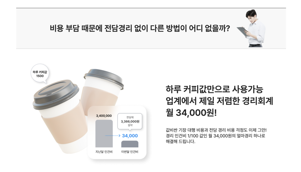 이렇게 편리한 솔루션을 월 34,000원에 이용하실 수 있습니다. 대표님이 직접 회계 업무를 하더라도 큰 부담 없이 시작하실 수 있고, 경리 담당자를 채용하더라도 큰 어려움 없이 업무 인계가 가능합니다.