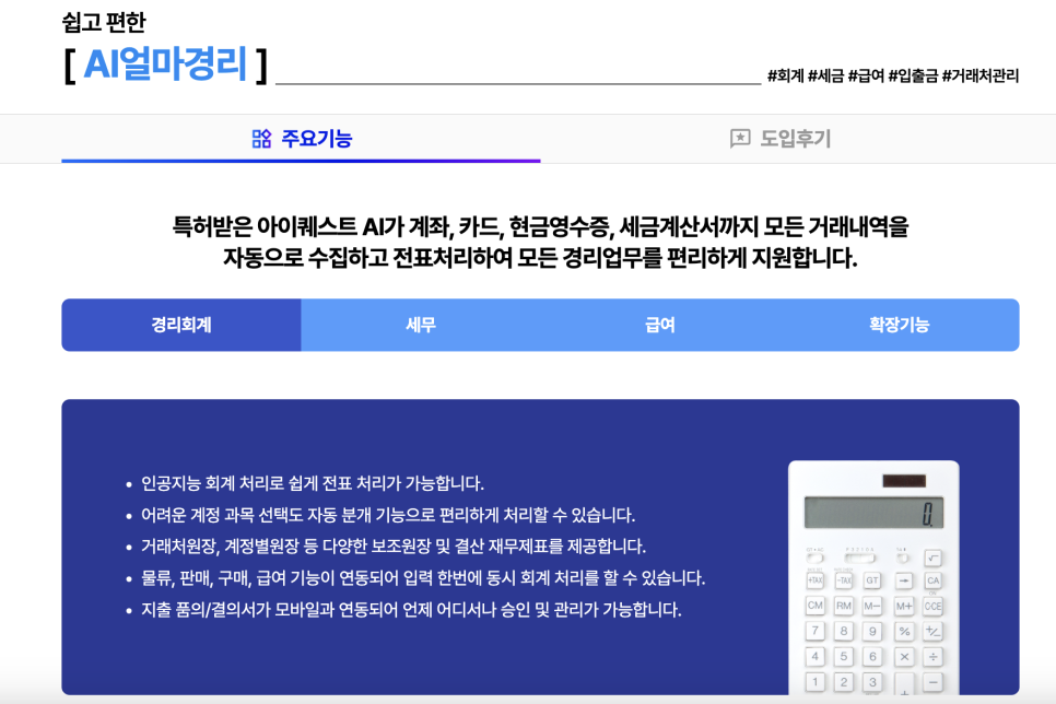 [얼마경리]는 초보자도 쉽게 사용할 수 있는 AI 경리회계 솔루션이에요. 어려운 경리회계 실무도 AI 자동분개 및 전표처리 기능으로 쉽고 효율적으로 처리할 수 있어요.