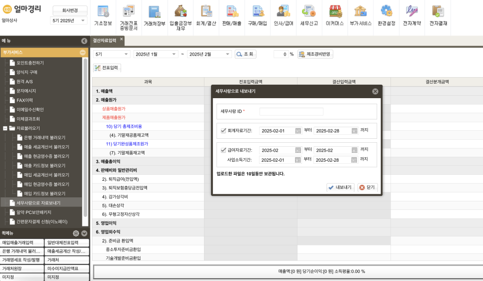 그러므로 다시 한 번 말씀드리지만, 경리회계 프로그램을 선택할 때는 반드시 세무사랑과 연동되는지 확인해야 합니다.