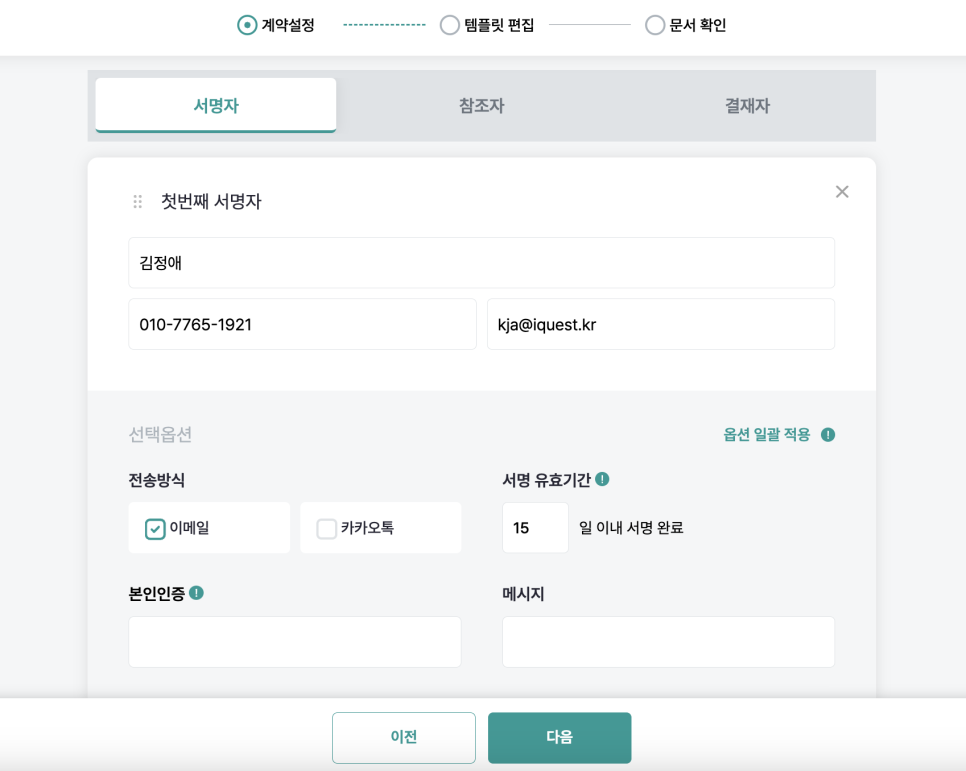 전자계약서가 작성되면 이메일이나 카카오톡, 문자 메시지 등 온라인으로 전송할 수 있어서 계약서 검토에 투입되는 시간을 대폭 절약할 수 있습니다.