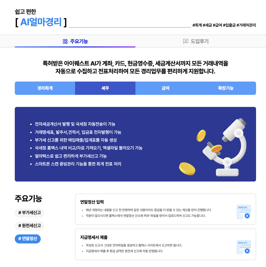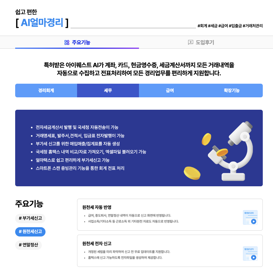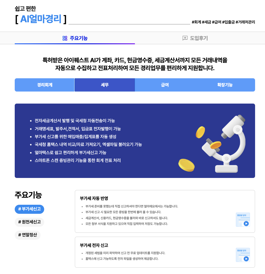 정확한 세무는 안정적으로 사업을 운영하기 위한 첫 걸음입니다. 사업주분들이 국세와 지방세를 실수 없이 납부할 수 있도록 [AI얼마경리]가 도와드리겠습니다.