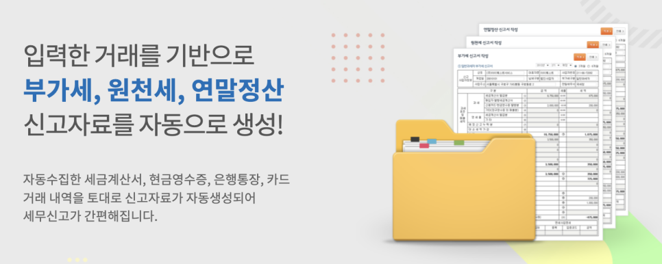 [AI얼마경리]를 이용하면 국세와 지방세를 직접 신고할 수 있어요. [AI얼마경리] AI 기능이 사업자 통장과 카드 거래 기록, 현금영수증 발급 내역, 세금계산서 등을 분석 및 계산하여 납부 세액을 계산합니다.