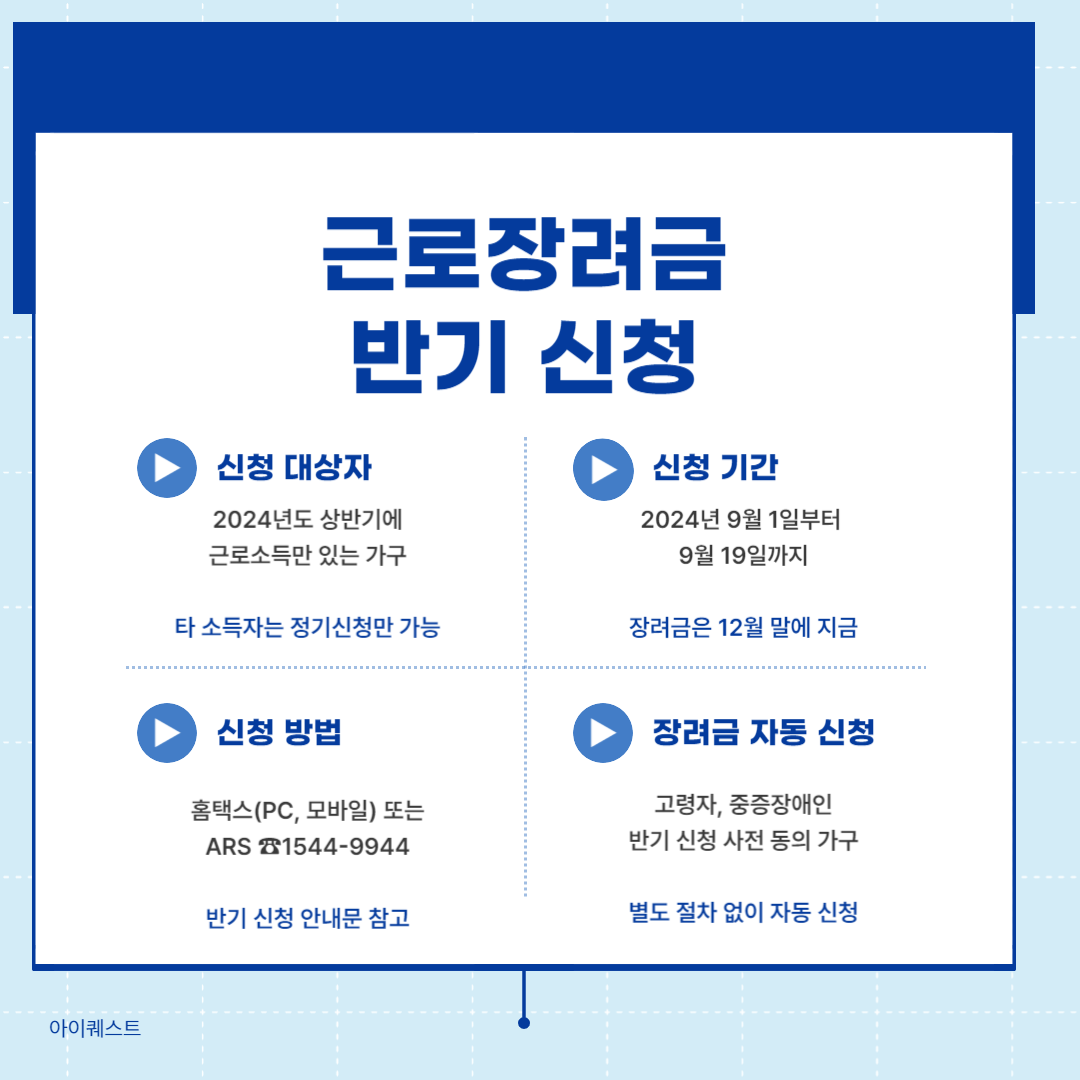 근로장려금 반기 신청은 2024년 상반기에 근로소득만 있는 가구에서 신청할 수 있습니다. 근로소득 외 사업소득이나 종교인 소득이 있는 경우에는 내년 5월에 정기 신청만 가능하며, '24년 상반기분 신청을 한 경우에는 '24년 하반기분 근로장려금도 신청한 것으로 보아 별도 신청을 하지 않아도 됩니다.