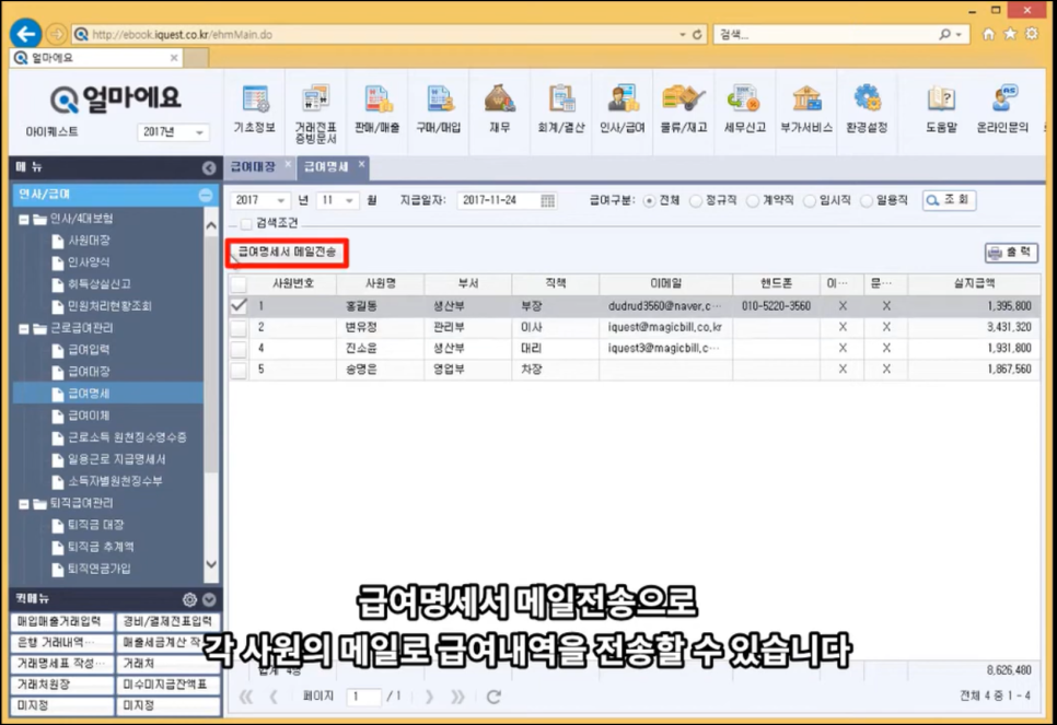 매월 지급된 급여에 대한 급여명세서가 자동으로 생성되는지, 또한 바로 직원에게 메일을 발송할 수 있는지도 확인해 보세요. 급여명세서 지급은 이제 의무입니다.