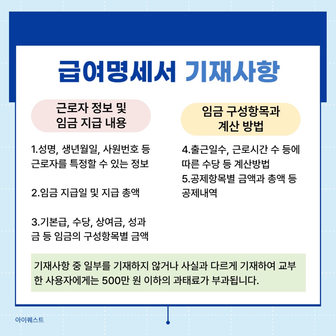 사업주가 근로자에게 급여명세서를 교부할 때, 가장 중요한 것은 명세서에 기재사항을 모두 올바르게 기재하였는지 여부입니다. 이러한 사항을 누락하거나 사실과 다르게 기재하여 교부하는 경우에는 500만원 이하의 과태료가 부과되고, 임금체불 등의 분쟁 등이 발생할 수 있으므로 유의하여 업무하셔야 합니다.