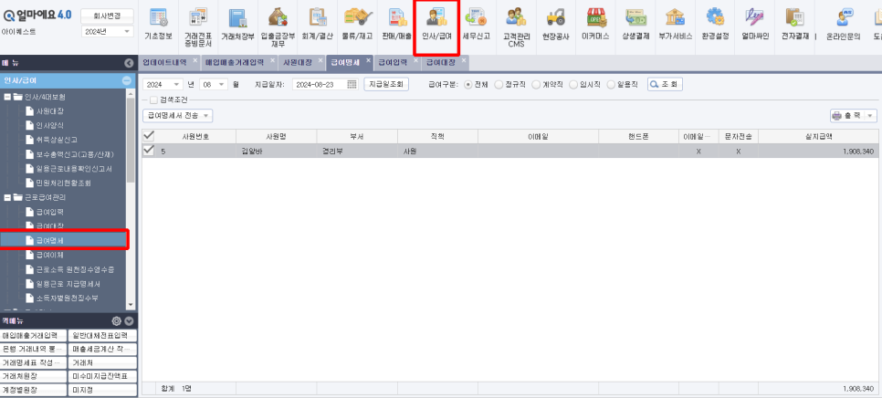 다음은 ‘얼마에요ERP’에서 급여명세서 발행하는 방법입니다.