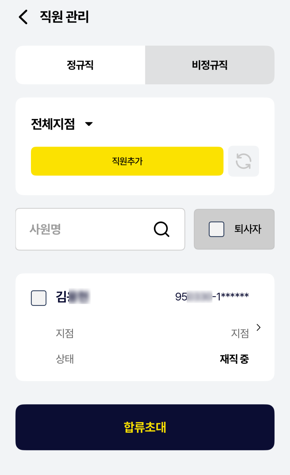 직원 관리 기능 : 지점별로, 정규직, 비정규직 별로 직원 관리가 가능하며 퇴사자 정보도 검색하여 바로 확인할 수 있습니다.