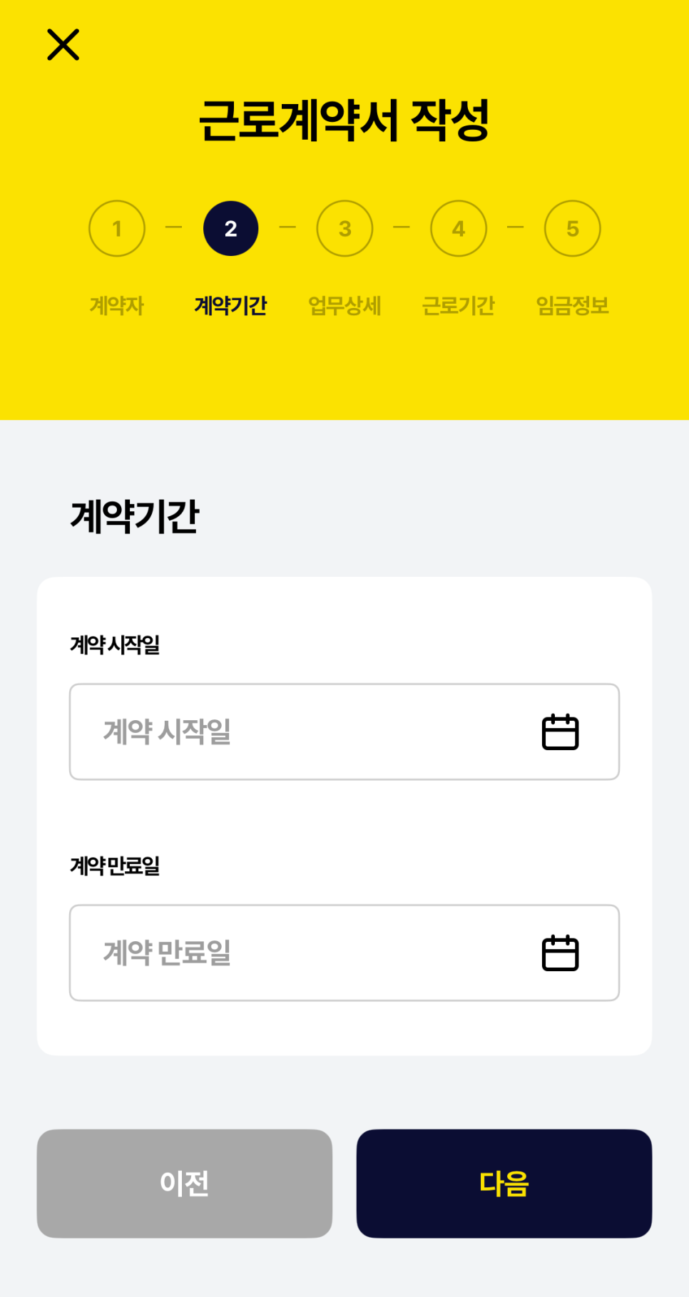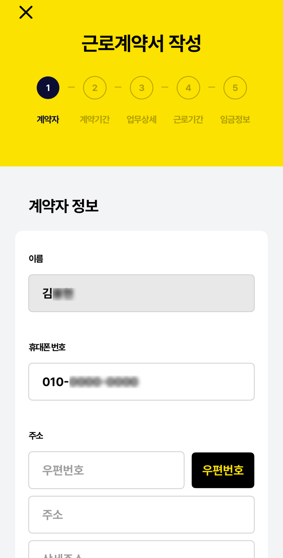 근로계약서 작성 기능 : 어플로 근로계약서를 작성할 수 있습니다. 계약자 정보, 계약 기간, 업무 내용, 근로기간, 임금정보 등 필요한 모든 내용을 간편하게 입력할 수 있습니다.