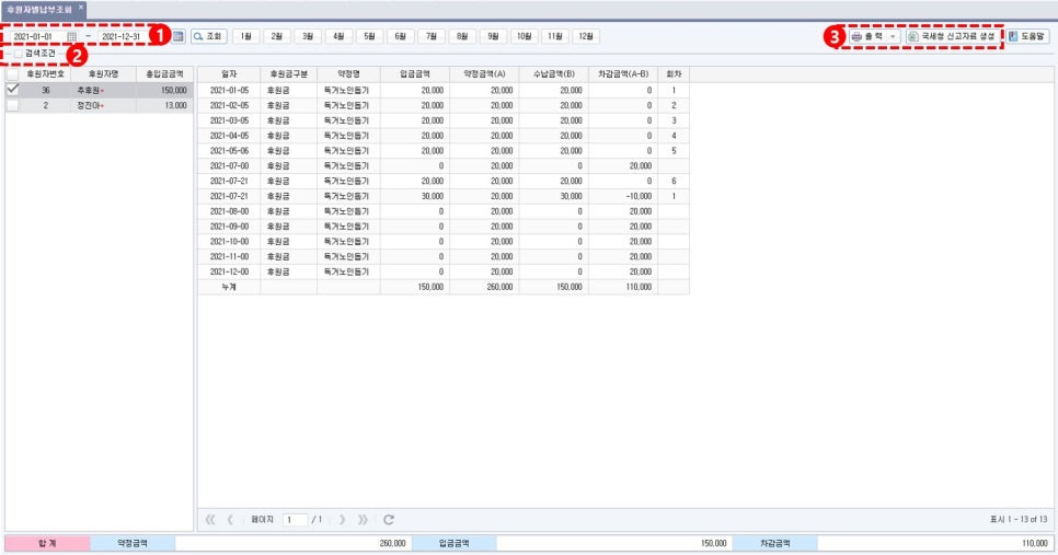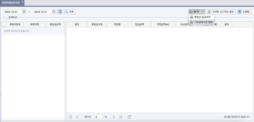 ‘후원자별납부조회’에서 기부금 납입 내역을 확인할 수 있고 바로 기부금 영수증도 발급할 수 있어요.