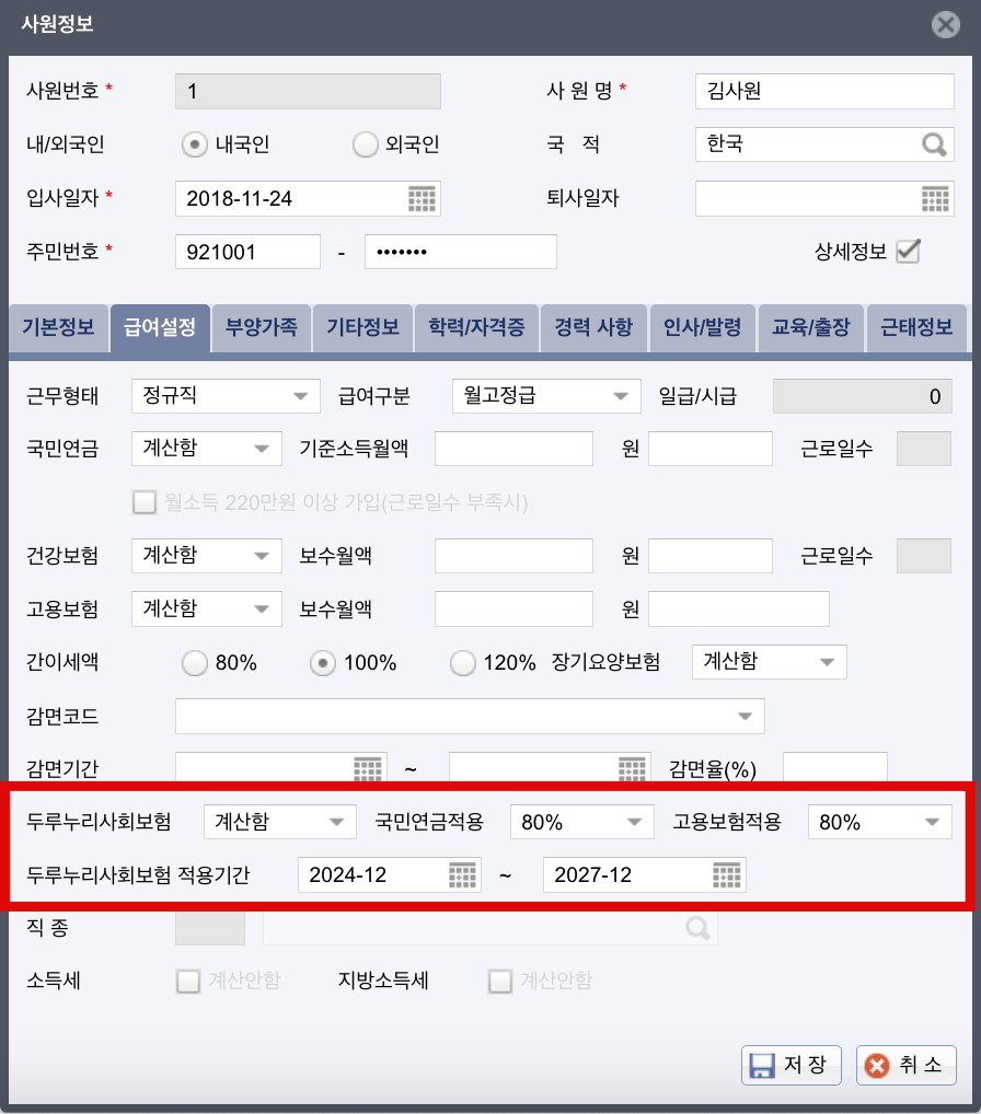 [사원대장]에서 근로자 정보를 입력할 때 ‘두루누리사회보험’을 ‘계산함’으로 설정하고 공제 비율과 적용 기간을 설정해 주세요.