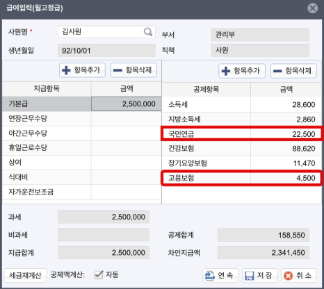 이후 [급여입력] 화면에서 해당 근로자를 클릭 후 급여를 입력하면 국민연금과 고용보험료가 자동으로 80% 공제된 것을 확인할 수 있어요. ‘두루누리사회보험’을 적용 안했을 때와 비교해보면 더욱 확실하게 알 수 있어요.