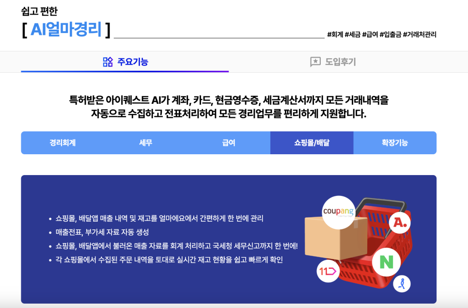 아이퀘스트의 AI 경리회계 솔루션 [AI얼마경리]는 이커머스 매출관리 기능을 지원하는데요. 오픈마켓에서 판매를 하는 경우 각 쇼핑몰의 매출내역 및 재고를 간편하게 연동해서 관리할 수 있습니다.