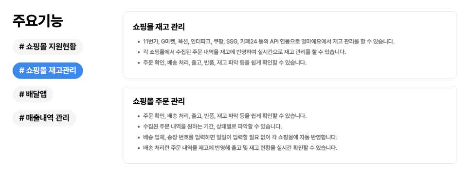 - 오픈마켓 등 각 플랫폼의 API를 연동하여 매출 데이터를 자동으로 불러와서 실시간으로 확인할 수 있어요. 사람이 일일이 입력하지 않아도 되니 실수도 줄어들어요.