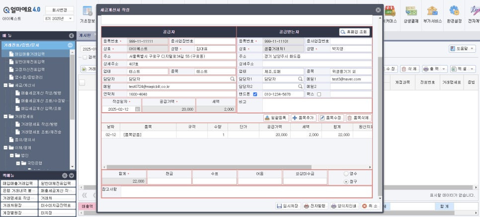 3. 매출 등록 시 프로그램 내에서 바로 세금계산서 발행이 가능합니다.