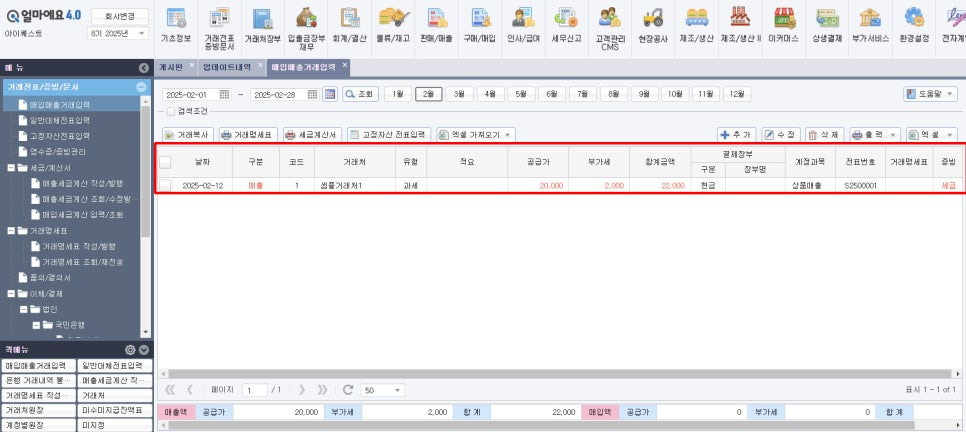 4. 등록이 완료된 화면입니다. ‘수정’ ‘삭제’를 통해 변경 사항이 있을 시 조절할 수 있으며, 기간별로 매입매출 내역을 편하게 찾아보실 수 있습니다.