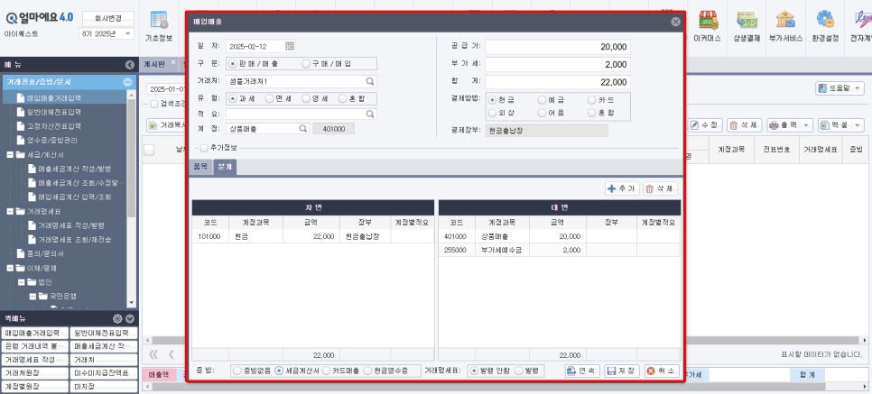 저장 시 자동으로 차변과 대변으로 구분되어 입력됩니다.