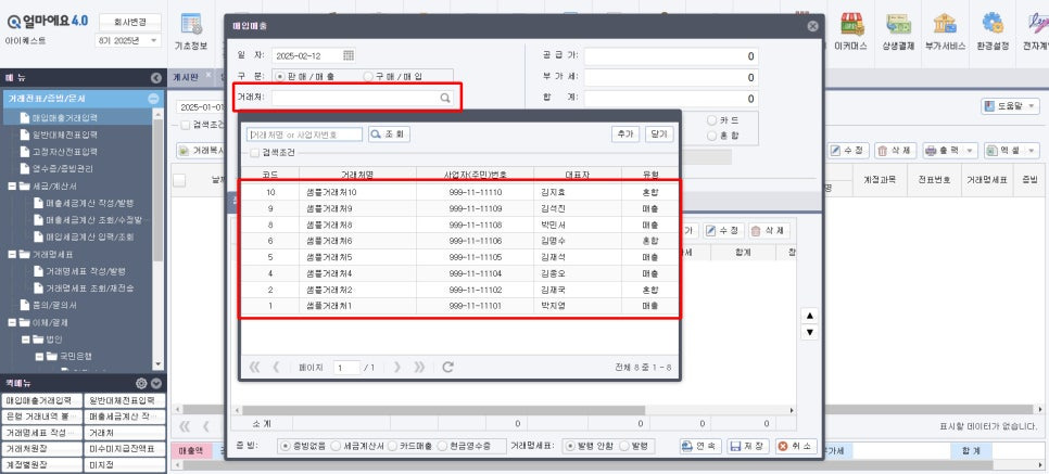 거래처와 계정 과목의 경우 클릭 시, 기존 거래처 목록과 계정 목록이 자동으로 조회되기 때문에 입력이 더욱 편리합니다.
