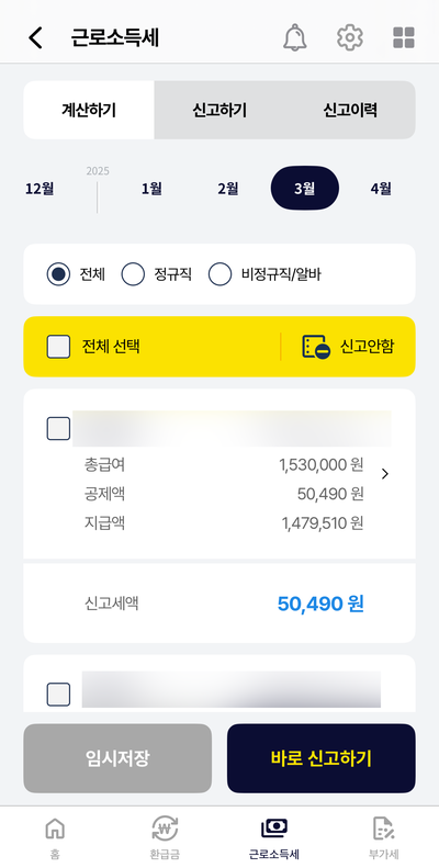 매월 번거로운 근로소득세 신고부터, 부가세 등 세금 계산 및 신고가 앱 내에서 가능합니다.