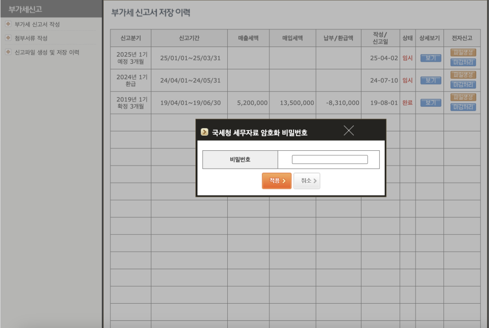 - 국세청 세무자료 비밀번호를 설정한 후 신고파일을 저장하세요.