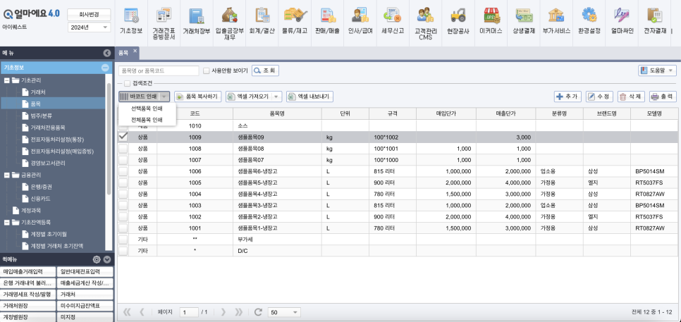 [얼마에요ERP]에 등록된 제품 정보를 바탕으로 바코드를 인쇄하여 제품에 부착할 수 있고, 신규 제품을 등록할 때 품목코드와 함께 바코드 번호도 직접 등록할 수 있습니다.