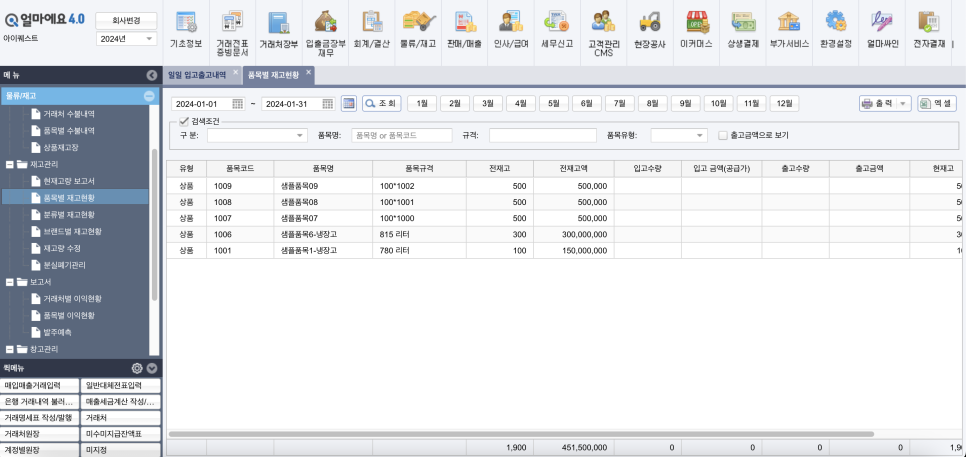 [얼마에요ERP]에서는 ‘재고 입출고 현황’과 ‘재고 수불 내역’을 관리할 수 있고, ‘품목별/분류별/브랜드별 재고 현황’ 기능을 이용하여 재고 현황을 보다 구체적으로 파악할 수 있습니다.
