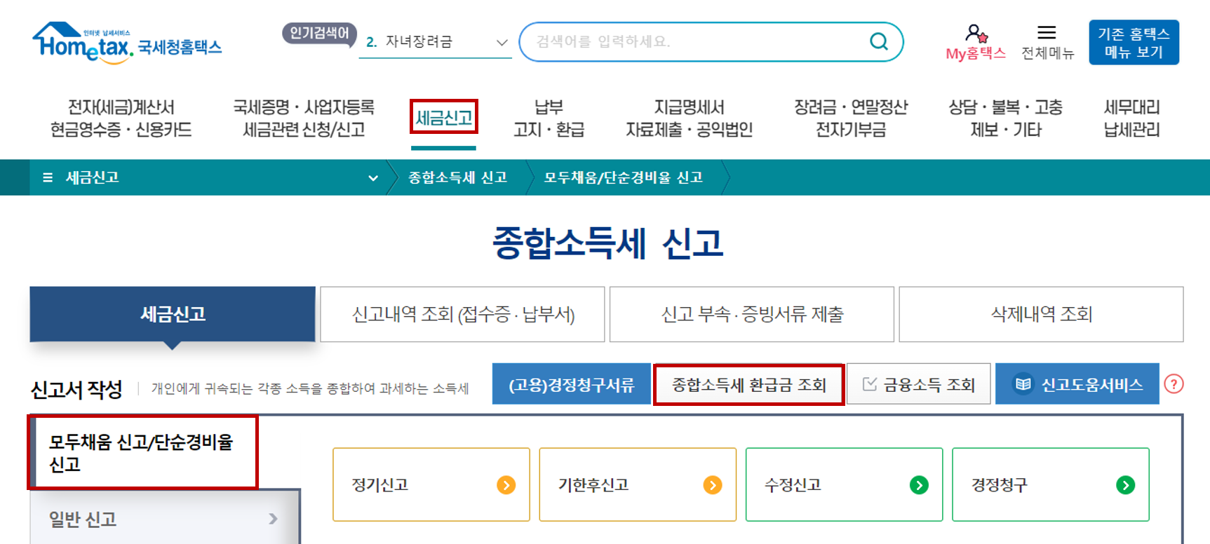 세금 신고 ▶ 종합소득세 신고 ▶ 모두채움/단순경비율 신고 ▶ 종합소득세 환급금 조회