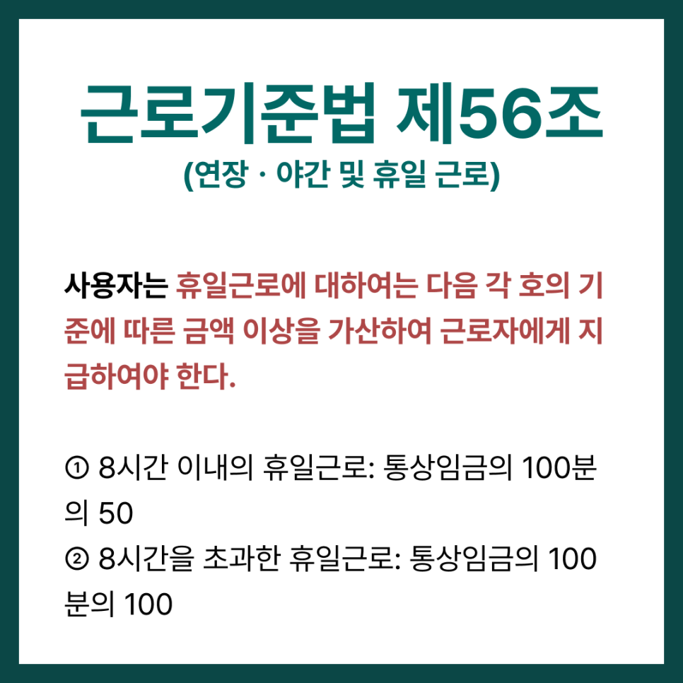 여기에 만약 야간근로(밤 10시 ~ 다음 날 오전 6시 사이에 근로하는 것을 뜻함)까지 하게 된다면 야간근로 수당(통상임금의 50%)까지 가산하여 지급해야 합니다.