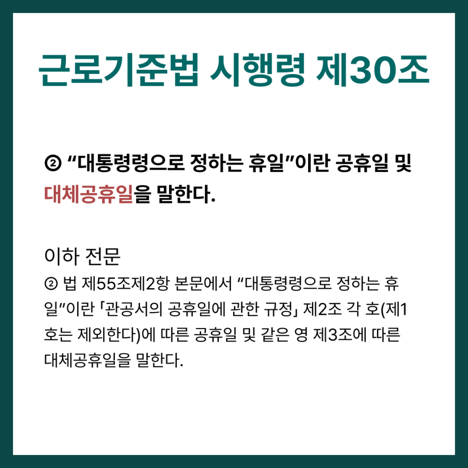 근로기준법 시행령 제30조에 따라 대체공휴일도 엄연히 공휴일의 한 종류이기 때문에 휴일근로 수당/보상 휴가가 지급되어야 합니다.