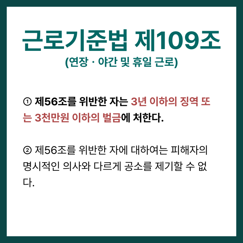 만약 사용자가 휴일근로 수당을 지급하지 않으면 근로기준법 제56조와 109조에 따라 3년 이하의 징역 또는 2천만 원 이하의 벌금형에 처해질 수 있기 때문에 휴일 근로에 대한 보상은 철저하게 지급해주셔야 합니다.