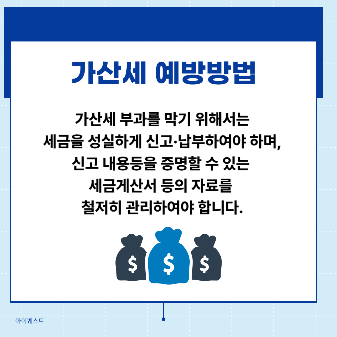 가산세를 예방하기 위해서는 성실하게 신고 및 납부를 진행하여야 하며, 신고 내용 등을 증명할 수 있는 세금계산서 등의 자료를 철저히 관리하여야 합니다. 사업자별 과세유형 등에 따라 알맞은 기간에 세금을 신고·납부하고, 재화나 용역을 공급하면서 세금계산서 등을 발급하실 때에는 기재사항 등을 꼼꼼히 작성하셔야 합니다. 또한 부가세 신고시 매출처별 세금계산서 합계표 등을 올바르게 작성 및 제출할 수 있도록 유의하시기 바랍니다.