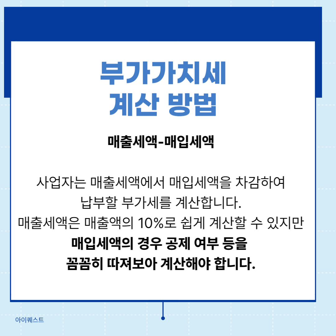 매출세액은 세금계산서 교부분과 현금영수증, 신용카드 매출전표 등 기타 모든 매출을 합산하여 계산합니다. 매출액을 먼저 계산하고 부가가치세율 10%를 적용하면 매출세액을 계산할 수 있습니다. 매출세액을 누락하는 경우에는 가산세가 부과되며, 추징이나 세무조사 등의 불이익을 받을 수 있습니다. 그리고 매입세액은 세금계산서 수취분에 공제 매입세액 등을 모두 합산하여 계산합니다. 다만 사업과 관련이 있으면서 적격증빙을 수취한 매입분 등에 한해서만 부가세에서 공제가 가능하기 때문에 계산시 유의하시기 바랍니다.